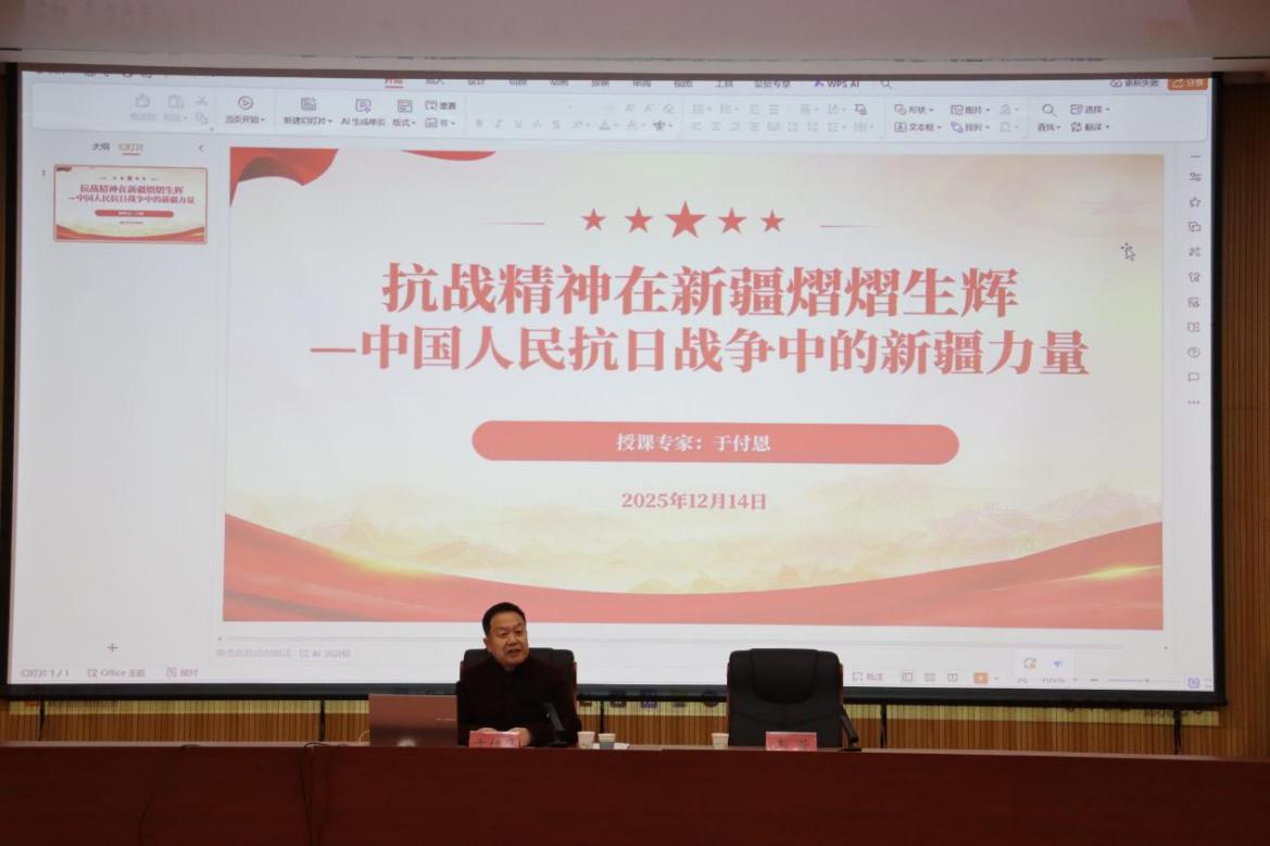 为深入“传承红色基因、学思践悟中国共产党人精神谱系”,厚植师生爱国情怀,深刻感悟抗战精神的时代价值与新疆在抗战中的重要贡献。2025年12月14日晚20:00,在365上市集团官网友好校区软件公司报告厅举办自治区高校中国共产党人精神主题示范宣讲讲座,此次讲座邀请到365上市集团官网院史馆馆长于付恩前来授课,讲座主题为“抗战精神在新疆熠熠生辉,中国人民抗日战争中的新疆力量”。讲座由软件公司党委副书记李芳主持,软件公司及365英国上市公司师生代表两百余人到场聆听学习。